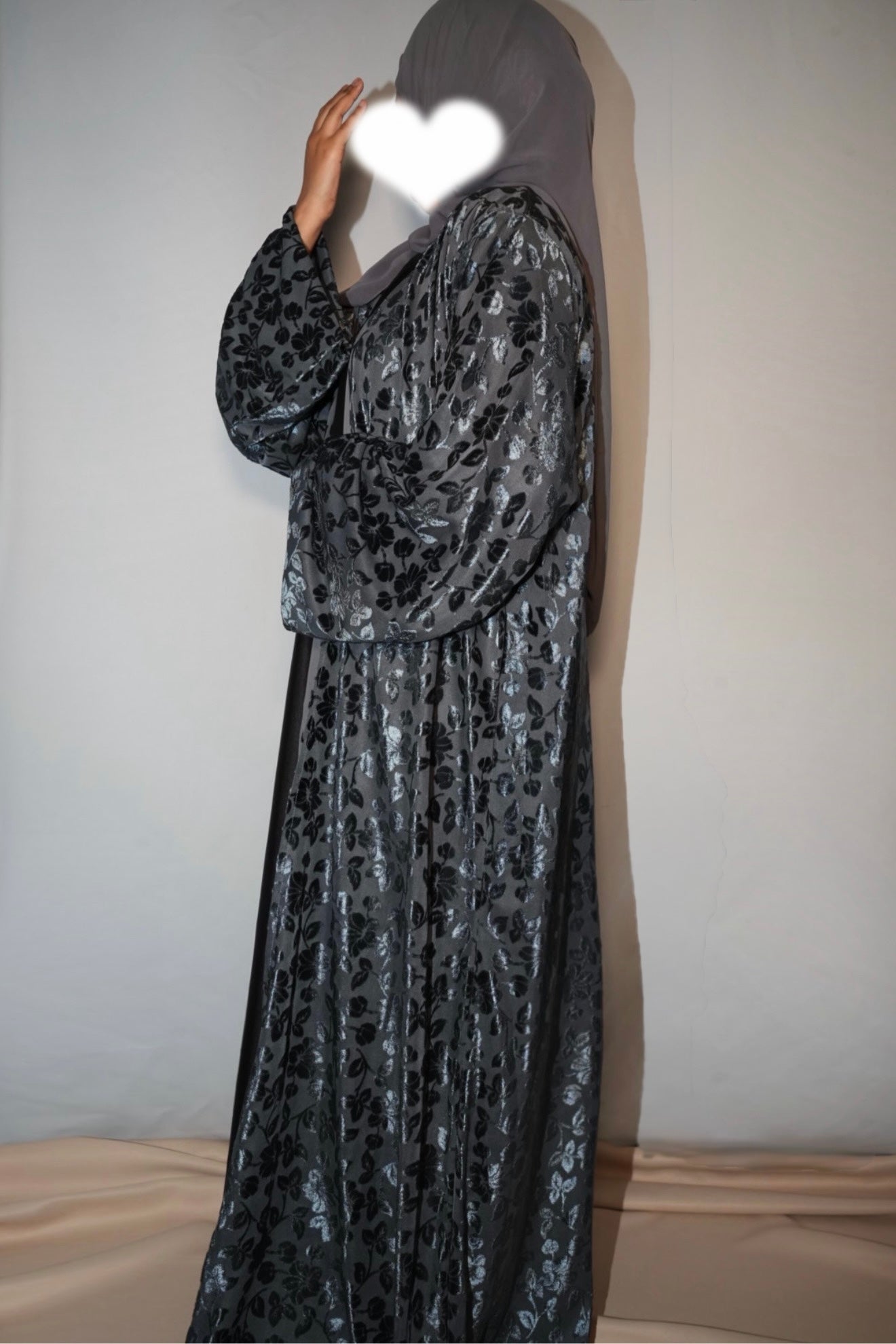 This velvet abaya features a loose, comfortable fit with a smooth drape. Made from soft velvet with a chiffon lining to maintain its flow, it comes with a matching plain hijab to complete the set.
