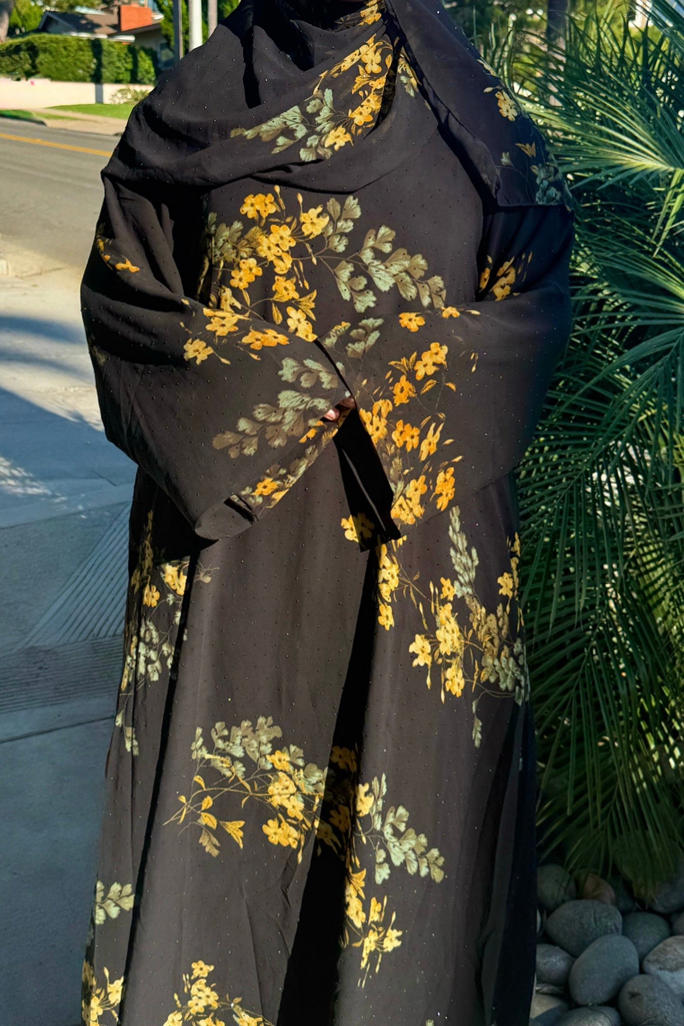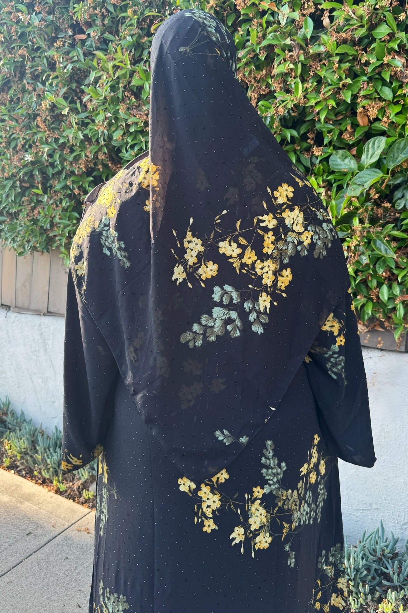 This crystal closed printed abaya features a floral design and a loose, comfortable fit. Made from lightweight chiffon with a chiffon lining to maintain its flow, it comes with a matching hijab in the same printed fabric.