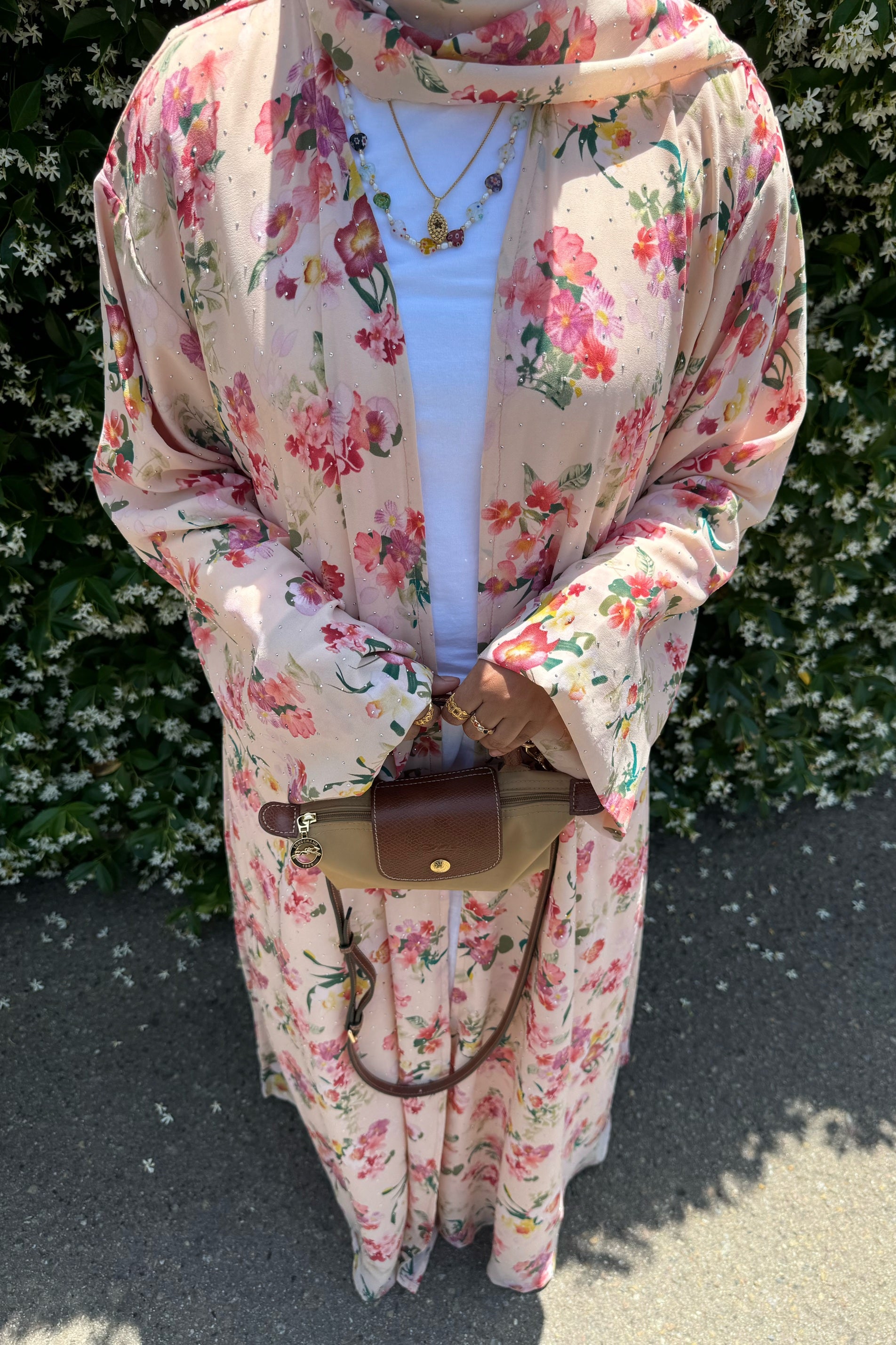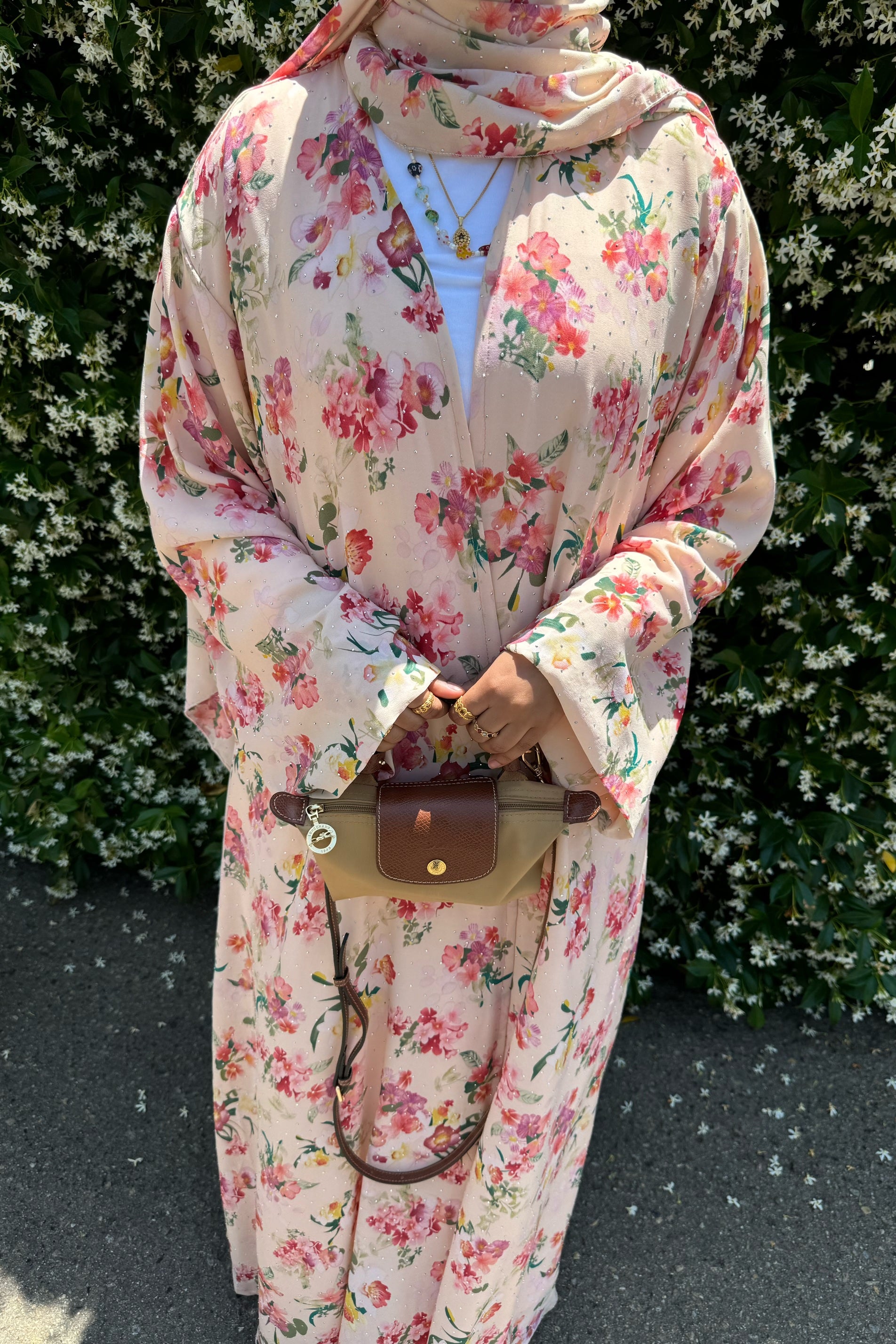 This crystal printed abaya features a soft floral design and a loose, comfortable fit, with sparkling crystals throughout. Made from lightweight chiffon with a chiffon lining to maintain its flow, it comes with a matching hijab in the same crystal printed fabric.