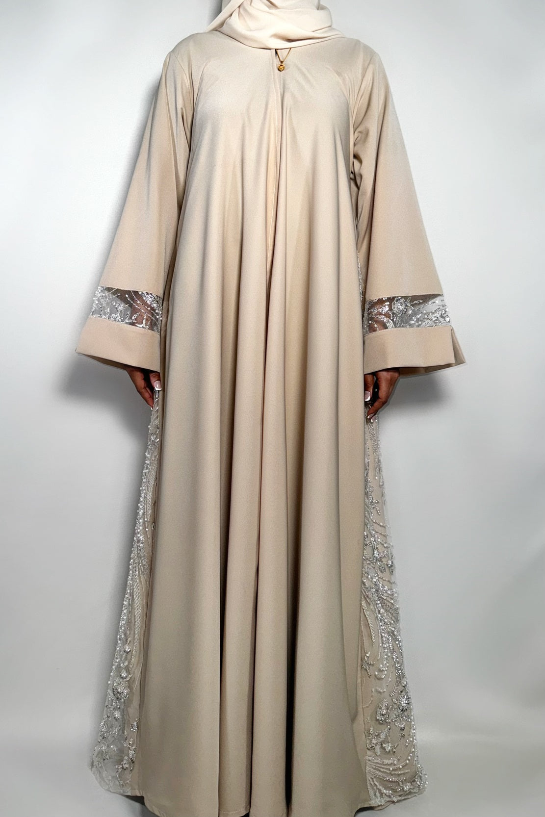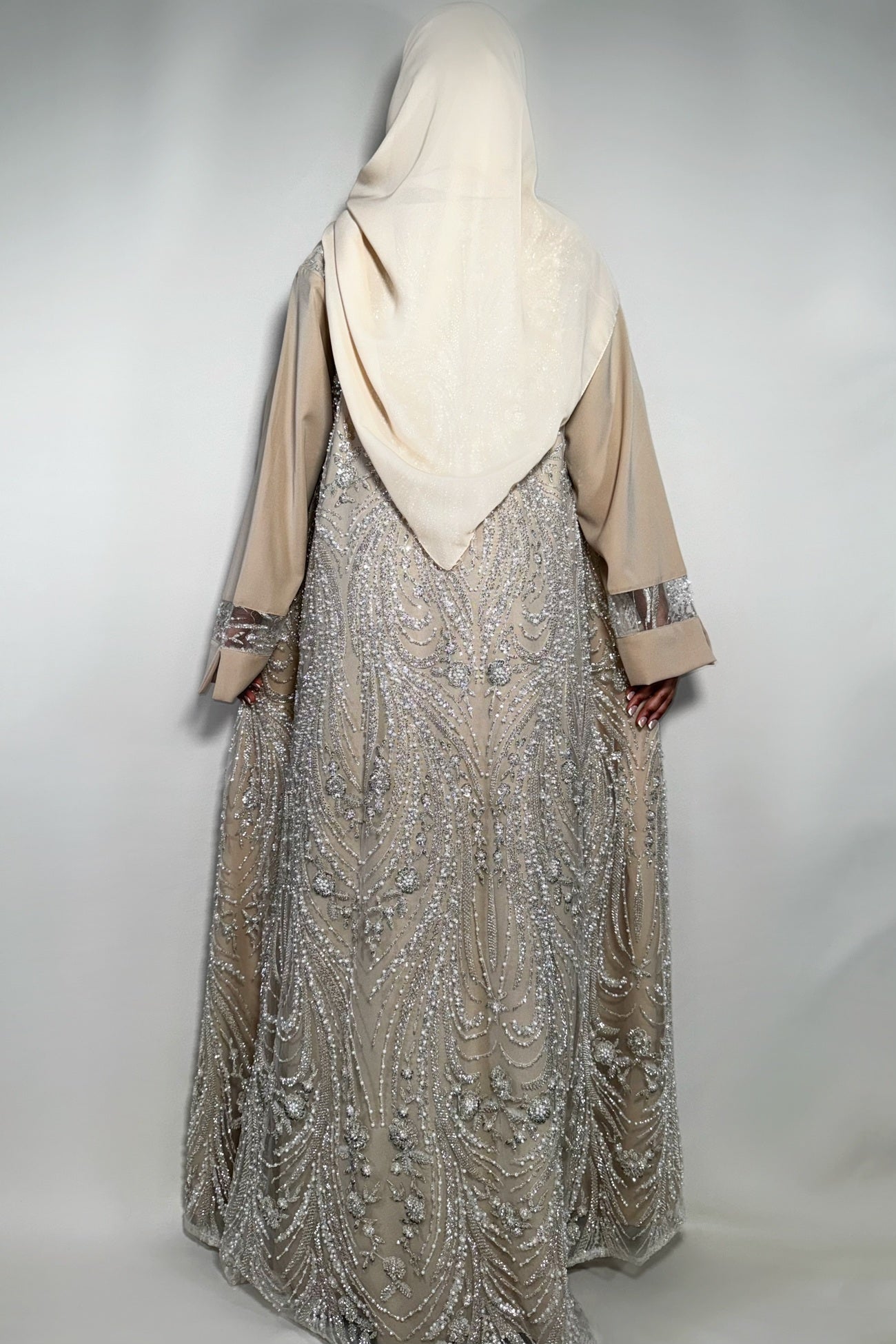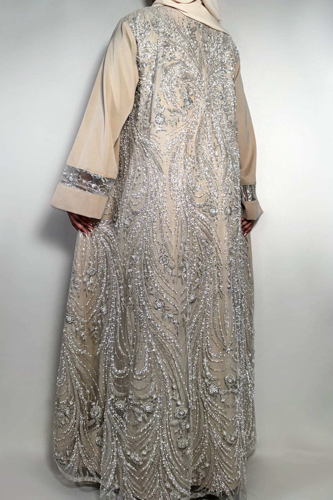 This abaya is crafted from crepe fabric and features a standard sleeve with a sheer panel adorned in delicate crystals. The back showcases an intricately beaded design, adding a touch of elegance. A slightly longer back hem makes it perfect for pairing with heels